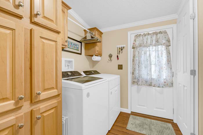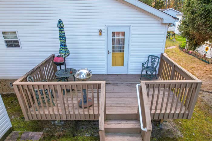 Homey features such as a space for a freezer in the laundry room, window over the sink, nice deep pantry, third door for access to the private open air deck just steps away from the 8x12 wood/vinyl/shingle shed