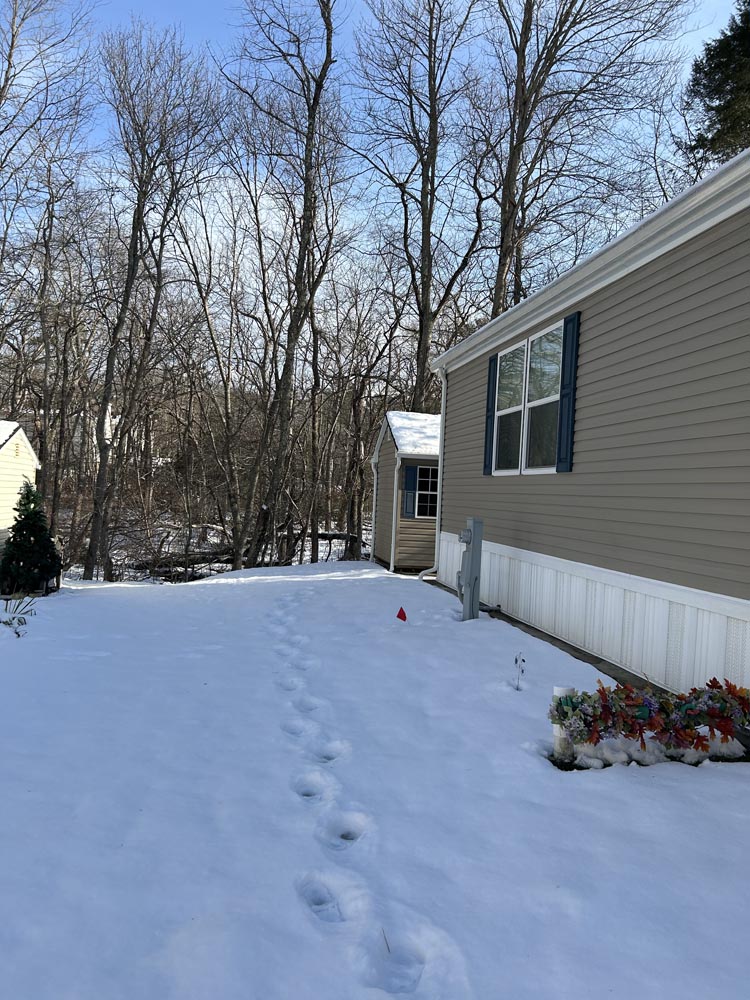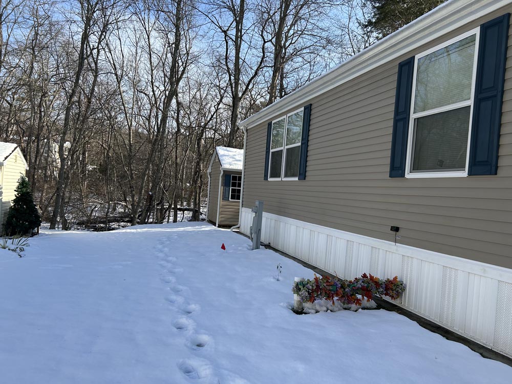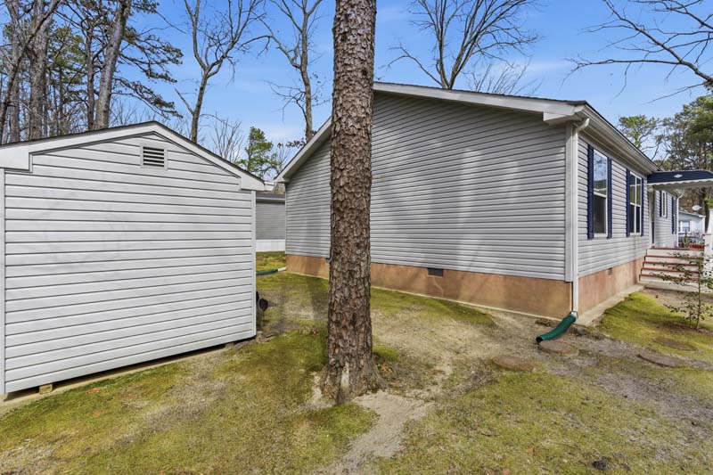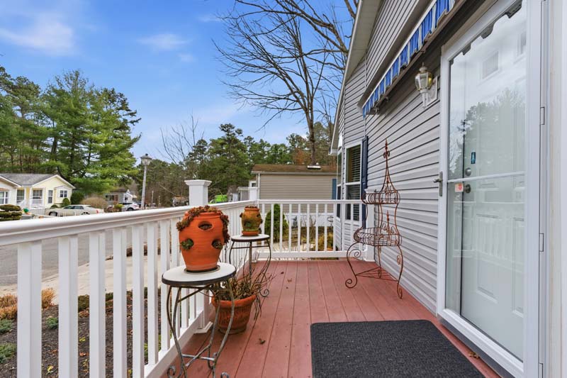 Outside, we will follow the concrete walkway to the front door. It's important to note this home has the look of a stone foundation, with access panels. The side door faces the street with a roll out awning over the composite decking for enjoying your morning coffee. Please note the 5/12 very residential roof. This is important because the higher the pitch, the more residential the appearance and the better flow of rain water into the gutters.
